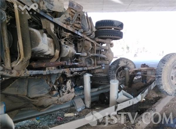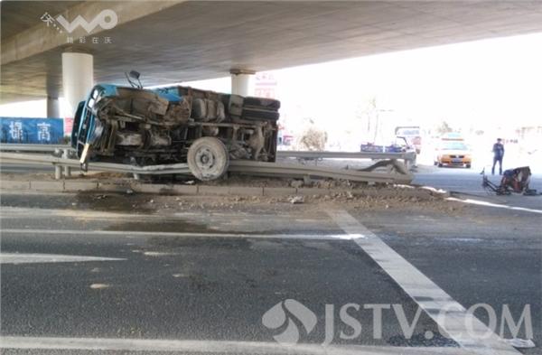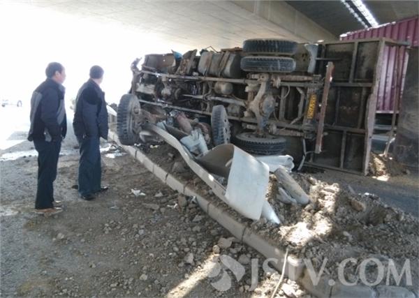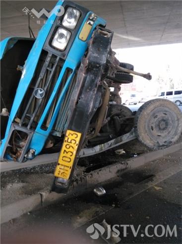 赶到现场时,受轻伤老人刚被120送往附近医院救治,现场触目惊心,运沙车整个底盘严重受损,前车轮在事故撞击中脱落,货车车头包括驾驶室变形,发动机已经报废,现场有5米左右的隔离护栏被撞损毁,幸亏车主及时避让,否则后果不堪设想。