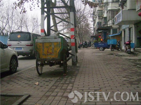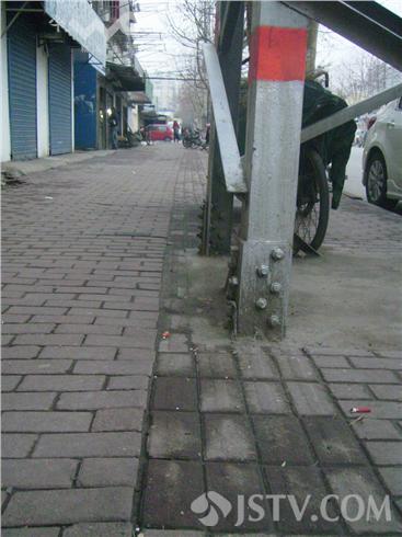 今天下午经过南京城北营苑北路时,发现路边一处高压铁架直接“站立”在盲道上,巍然耸立,看来经此盲道通行的盲人朋友非得碰壁不可啊。