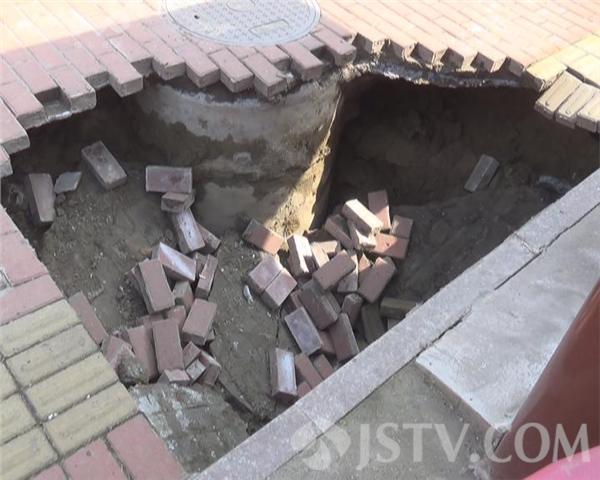 据伤者张女士介绍:'当时我站在这里晒太阳看报纸的,然后没有感觉突然朝下面一掉,掉下去慢深的,我晒太阳靠到北这个门,角落太阳比较好,掉下去后路上的水泥大块砖头等朝我身上一打,我就朝下面一歪,我这里骨头就打断了,医生检查下来左胸骨断裂了五根,去年也坍陷过,就是一个洞,就靠树那里一个小洞,随后有人来维修的,用土来填的,当时工作人员说这里不会坍陷,倒过混凝土的,行人走路不会坍陷,我当时就没有把这个当回事,当时坍陷下去还没有人发现,我想在里面爬上来,可是已经爬不上来了,随后有人走路看到,喊不得了,人坍陷下去了,然后就赶紧喊'救援',随后门口保安把我拉上来的。'