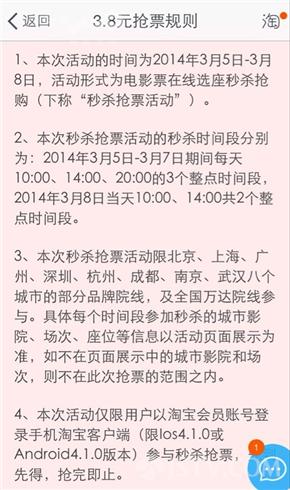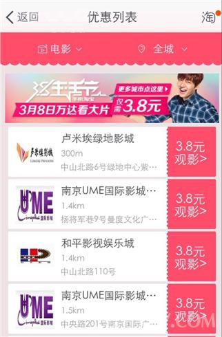 三八节即将到来之际,淘宝推出“三八生活节,3.8元看大片”活动,在北京、上海、广州、深圳、杭州、成都、南京、武汉等八个城市的部分品牌院线和全国所有万达院线,只要在规定的时间段内完成在线选座秒杀抢购,就可仅花3.8元观看影片。但参加此次活动有一个前提,阿里巴巴将对象锁定为手机淘宝用户,即消费者首先需要下载手机淘宝客户端,使用手机淘宝支付,才可享受这些优惠。据了解,这次活动的主体是线下的娱乐场所,包括南京万达影城、UME国际影城、卢米埃、幸福南海国际影城、上影国际等20家影院。活动当日影院被阿里巴巴全天包场。