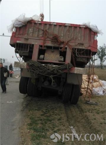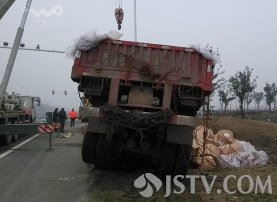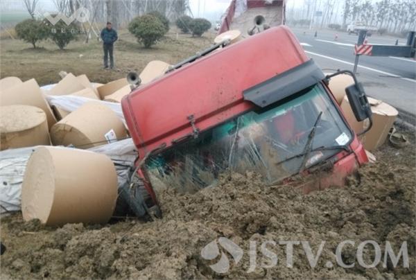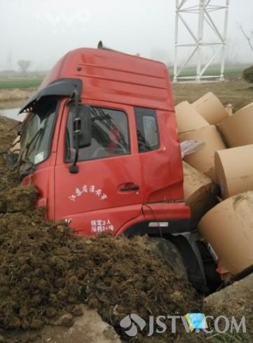 场看到吊车和吊车纷纷赶来准备救援,整辆货车呈现凹形陷入河沟中,车头卡在泥土中不能动弹,车头和车身底部受损,车上大部分纸片都落入水中损失惨重。司机张先生表示自己非常无奈,这些新闻纸片都是从山东厂家进货准备送到南京一家印刷厂,如果自己不让车那就撞车,自己让车就遭受损失。