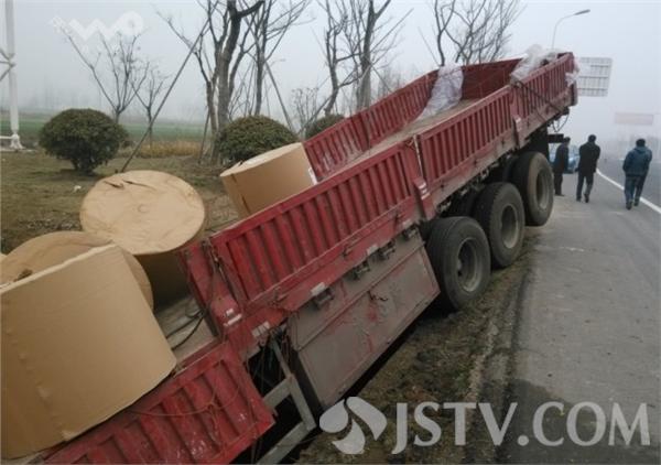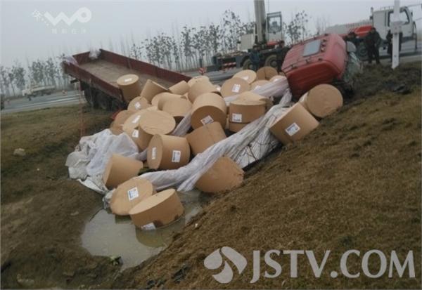 3月10日凌晨2点左右,S328省道淮金线上,一辆半挂货车在正常行驶过程中,因为路上有雾气车速并未开快,一辆轿车速快突然变道超车,货车司机为了避免两车相撞连忙往右打方向,货车连人带车冲下路边河沟,满满一车30吨彩色胶印新闻纸大部分落入水中,违规变道轿车却溜之大吉。