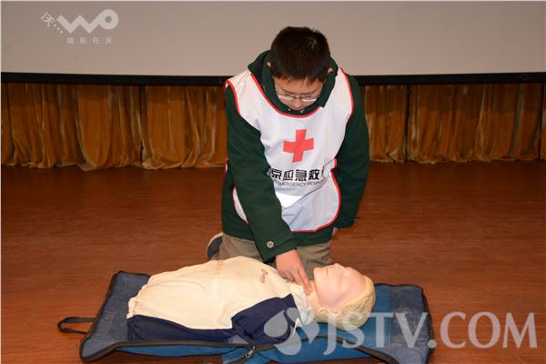 在救护知识演示环节,各班的志愿者经过认真的准备与培训,为同学们演示了心肺复苏、8字包扎等生命救护技巧与方法,他们的专业表现赢得了同学们的掌声。