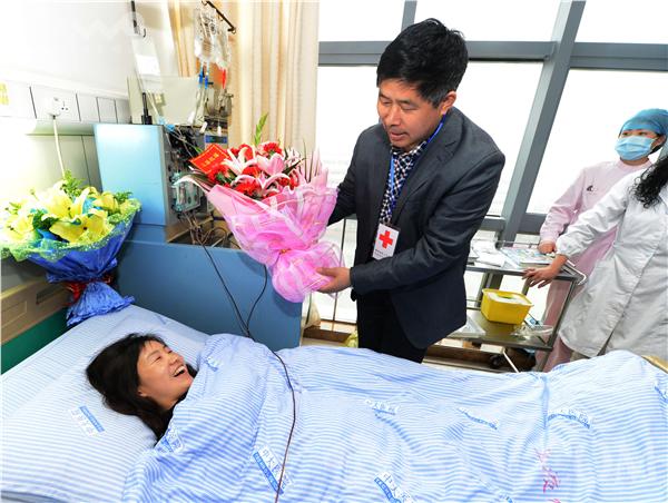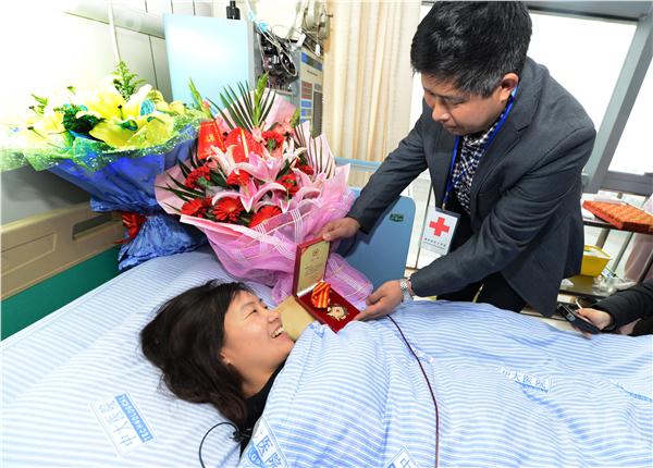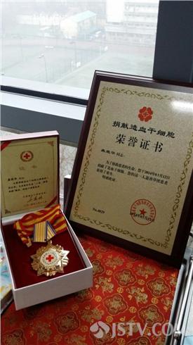 3月12日上午,南京市红十字会副会长张杰和工作人员专程前往中大医院探望龚荣华,向她致以真诚的感谢和诚挚的祝福,并送上了中国红十字会和江苏省红十字会捐献造血干细胞的荣誉证书和勋章。