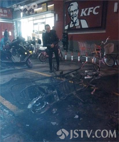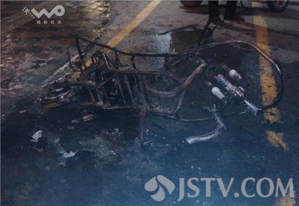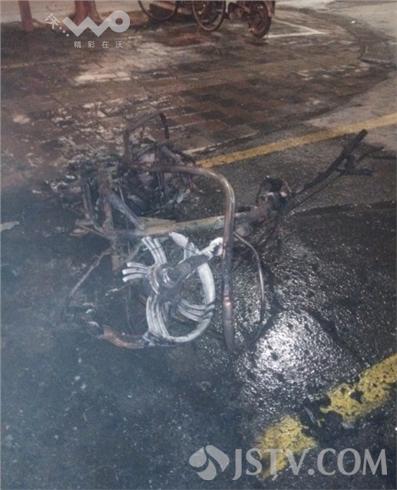 自称电动车车主张先生和妻子拎着大包小包的商品来到电动车旁顿时傻了眼,看到眼前的电动车已被烧成骨架非常郁闷,当张先生透露,晚上一家三口骑车来超市购物,人当时在超市根本不知道电动车起火,车子用了五六年,幸亏是在这里起火,要是在家里起火或是半夜起火的话,后果真是不堪设想呀!