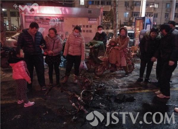 3月12日晚上19:20分左右,在淮安市清浦区解放东路乐天玛特超市门前非机动车停车场上一辆电动车突然发生自燃,现场火光四起附近店主纷纷拿出灭火器出来灭火。