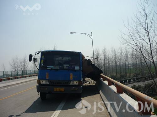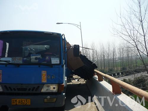 3月17日上午在兴化229省道安丰唐家庄高架桥发生惊险一幕,一由南向北逆行的大卡车在行驶过程中,车上装载的货物突然松开,砸向高架桥的护栏,要不是护栏阻挡,坠落到桥下的盐靖高速公路上后果不堪设想。