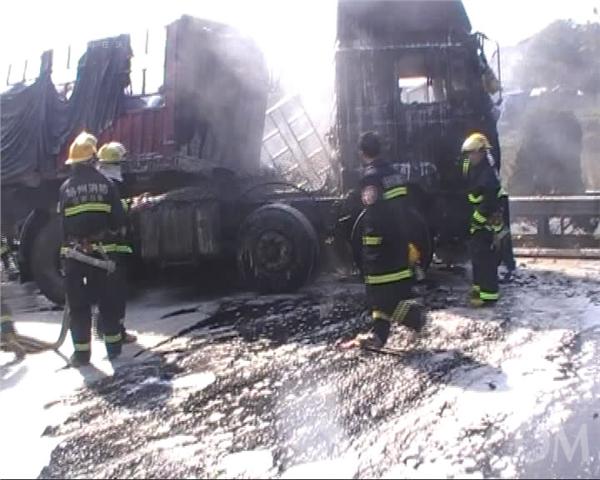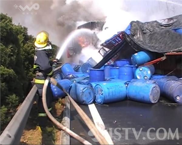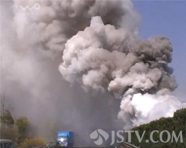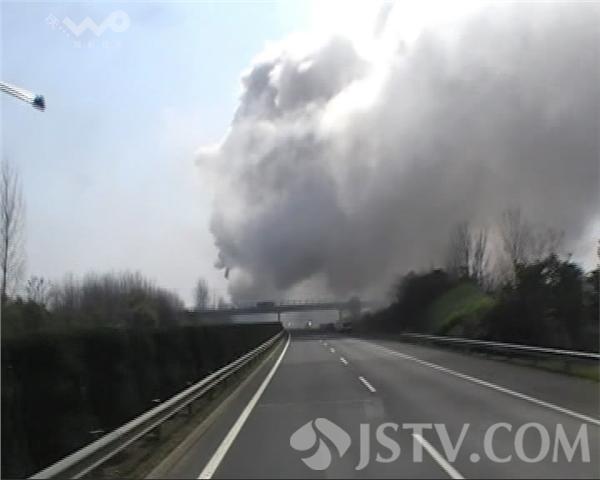 昨天下午1点30分左右,沪陕高速公路扬州西出口往北2公里处,一辆奥迪轿车与一辆装载约30吨危险品的半挂货车在超车时相撞,另一辆厢式货车被刮蹭,车上危险品散落并泄漏,现场燃起大火,腾起“蘑菇云”。为防意外,交巡警对事故路段的高速公路进行封锁,禁止车辆通行和无关人员靠近。据了解,塑料桶内装载的化学品亚磷酸二甲脂,易燃,是一种无色透明液体,每只桶装液体约250公斤。初步了解,当时一辆装载肉食的厢式货车正常行驶,载危险品的货车在超车道超车,后方一辆黑色奥迪车试图超车,撞上危险品车,危险品车则撞坏护栏。经过一小时的努力,明火被全部扑灭,危险车车头完全被烧毁,所幸无人员伤亡。