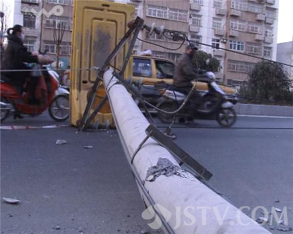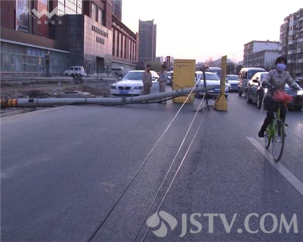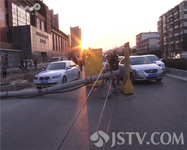 3月21日晚上5点多钟,徐州市云龙区和平路升辉装饰城北门,一根10多米长的10千伏高压电线杆突然倒下,横在了快车道上,占据了大半副路面,致使很多车辆不得不绕行,加上当时又是晚高峰时间,很多车辆都被堵在这里,形成了长达3里多路的车辆长龙。同时倒下的10千伏高压线还可能带电,当时情况非常危险。