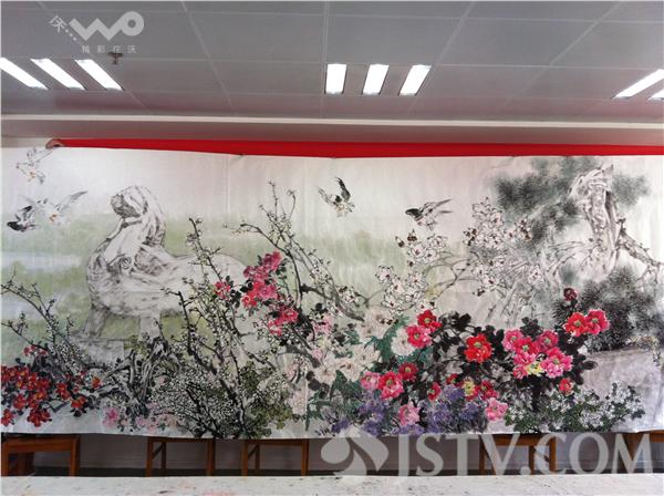 在南京特殊教育学院图书馆阅览大厅,一幅宽7米、高2米的《天地祥和万里春》的大画平铺在大桌上,老师学生围了一圈争相观看。画画的9位年已古稀的老人就是金陵组合的成员。他们当中的“金陵牡丹”陈培光说,我们作为南京的画家为青奥会在家门口举办感到骄傲,我们就想用集体的智慧、团队的精神创作一幅大作献给青奥会。画面有古岭公园的牡丹、中山陵的梅花、莫愁湖的海棠、玄武湖的杜鹃,组合在一起是百花盛开、绚丽多姿,一展南京风采。
