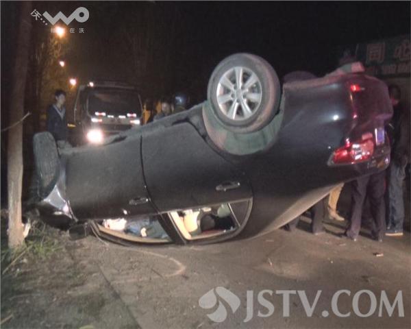 今天晚上10点半左右,在扬州望江路施桥横沟变电所附近,一辆轿车行驶到这里时,为了避让突然从西边巷子穿出的电瓶车,而冲到路边连根撞断一棵大树和一根路灯杆后,轿车四角朝天翻在路边,所幸安全气囊及时打开,车内两人没有大碍。