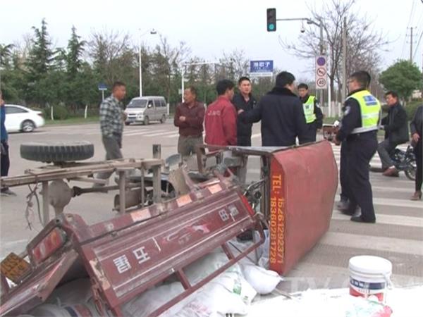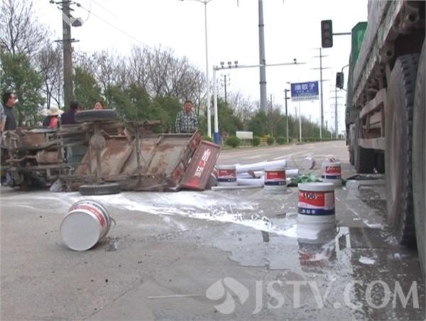 现场一辆满载方桩的大货车呈南北向停在道路中间,一辆满载涂料的电动三轮车已彻底散架,侧翻在货车的东侧,车上的涂料和涂料桶散落一地,有的飞出十几米,六十多岁的三轮车车主叶师傅惊魂未定,头上的一个伤口还在向外渗血,据他介绍,他当时骑着满载货物的三轮车从东往西行驶,在道路中间和这辆由北向南行驶的大货车相遇。