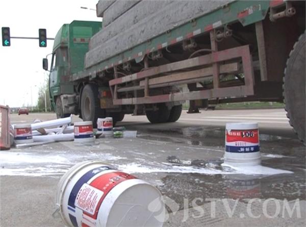 昨天下午五点多钟,宿迁经开区世纪大道和浦东路交叉的十字路口发生一起交通事故,一辆大货车撞上一辆运送涂料的三轮车,三轮车当场散架,车上的涂料桶被撞飞十几米,所幸车毁人安。