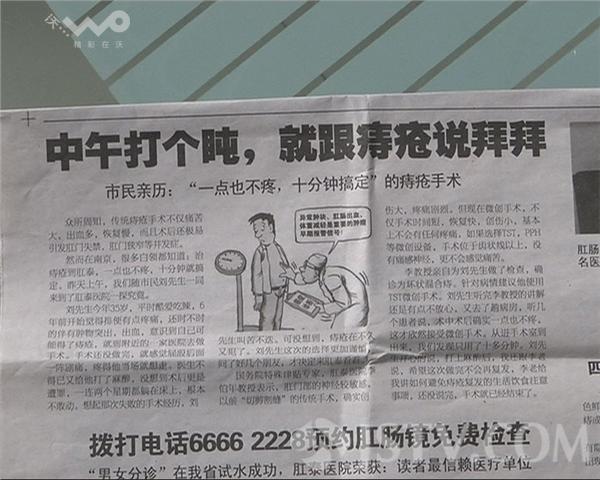 今年4月,王先生患上了肛门湿疹,在用药过程中不慎烫伤,为了尽快恢复,他在电脑上搜索后发现南京肛泰中医医院广告很多,而且报纸上也经常有“中午打个盹,就跟痔疮说拜拜”的广告宣传。于是他通过电话和这家医院取得了联系。