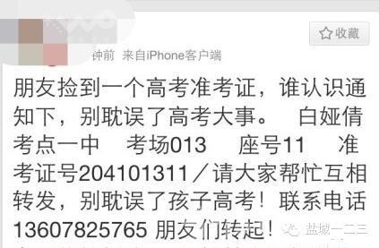 多位微信网友发来消息请求转发“朋友捡到一张高考准考证,白娅倩,考点一中,请大家帮忙互相转发。”经网站工作人员核实,这是一条假消息,类似谣言去年就曾出现过。教育部门表示,盐城高考准考证尚未发放。经记者查询,15935078941的归属地为山西晋城。记者在网上搜索“白娅倩”,发现了多条完全相同的消息,消息来自全国各地,并在微博、微信、QQ、贴吧等处流传。