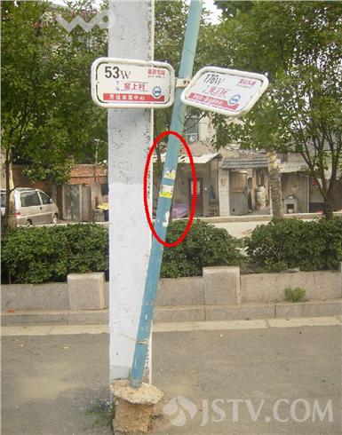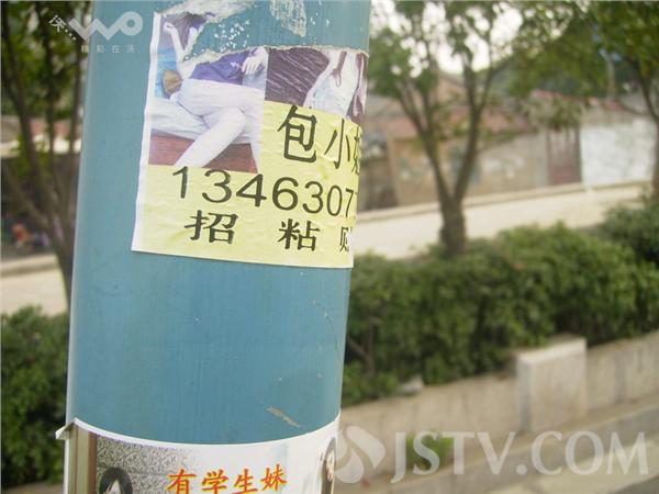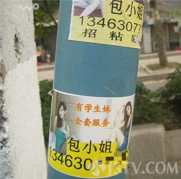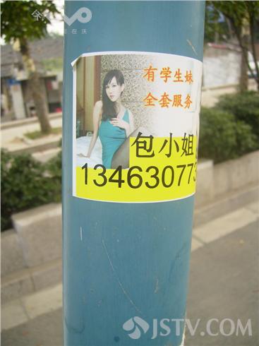 在南京幕府东路公交站台,两贴“包小姐”被贴上了站牌立柱上,高度仅不过一米,所有在此候车的打人小孩都能看见。小招贴上裸露“性感”的小姐风骚撩人,旁边还备注“有学生妹 全套服务”,下面并且直接留下联系电话。如此公然招贴,实在太过嚣张。