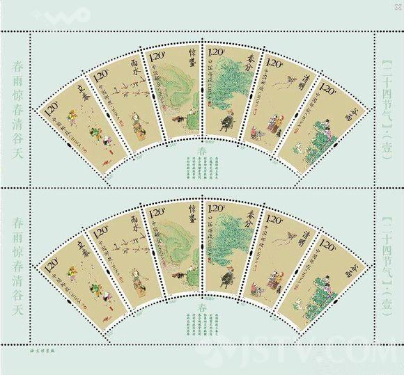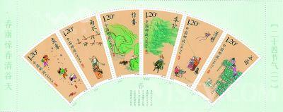 根据中国邮政2015年纪特邮票发行计划,中国邮政将于2015年2月4日发行《二十四节气(一)》邮票一套6枚,全套面值7.20元。内容分别为立春、雨水、惊蛰、春分、清明、谷雨。