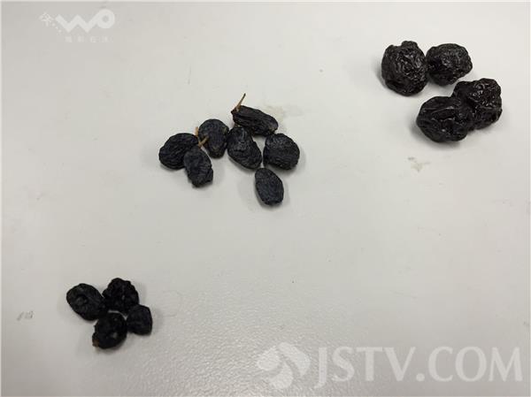 摊主的回答,让记者十分怀疑,同样叫蓝莓果干,但是,三家摊位卖的形状有大有小,有长有圆,相差甚远。随后,记者带了一些样品请教了专业人士的鉴定,三种所谓的蓝莓果干,都是黑葡萄干等冒充的。真正的蓝莓果干,圆润不带根,而且价格不可能低于每斤100元。
