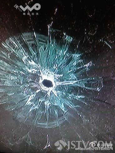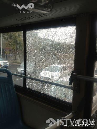 在第二次遭袭的52路车身上、可以看见一个明显的弹孔,由于威力巨大,两辆车的钢化玻璃全都粉碎,不得不临时停运。