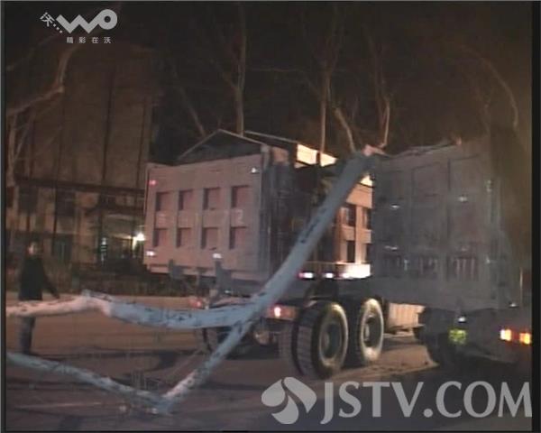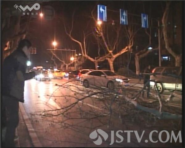 昨晚八点半左右,在南京市珠江路和黄浦路路口,一辆渣土车在转弯时,车厢尾部不慎刮到了路边的梧桐树,将一根30厘米粗的梧桐树干硬生生扯断,拖行十多米,横在马路中间。