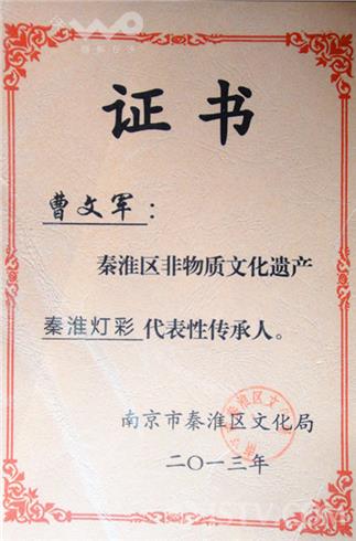多年来,曹师傅都是在十分用心地扎制花灯,与他相伴的还有妻子和儿子。谈到做花灯的辛苦,曹师傅说:“每盏精美的花灯背后面都需要手工艺人至少几十道的工序。”花灯上的花纹都是家人们用手工勒出来的,每一盏花灯都需要箍上30多道铁丝。每年曹大林的作坊要做4000多盏灯,光是箍铁丝的工序就要做上十多万次,为了精心制作好每只花灯,他们一家三口的手都被铁丝勒出了血口。说完,曹师傅展示了他满是伤痕的双手。有苦更有乐,每当秦淮灯会举办,自己辛勤扎制的花灯得到市民和游客的购买、肯定和赞赏时,那是最开心的时候。