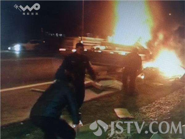 当晚六点左右,巡逻民警驾车经过崇启大桥启东东高速口收费站时突然发现,路口有一辆载满货物的卡车冒起浓浓黑烟。