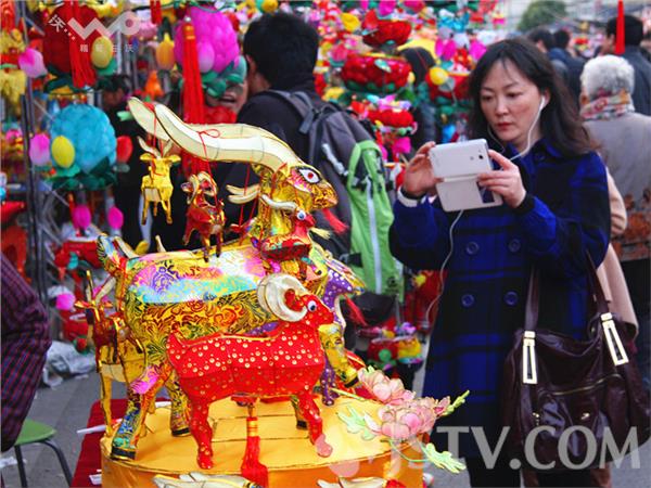 虽然总在万家团圆时辛劳,但曹师傅愿意守着自己一方小小的花灯摊,摊架上一盏盏羊年的生肖花灯和一串串或火红或粉艳的荷花灯,是他的心血,也是老曹半个多世纪始终割舍不下的情怀。