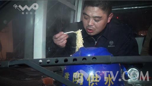 当自来水走漏处理完毕已经是晚上八点半,孙洪亮才坐到抢修车上泡吃方便面。这个时候爱人打来电话,他只是说还在外面工作,今年又不能回家过年了。看到此情此景的街访邻居,都说自来水公司的抢修工人很辛苦,放弃回家过年保障老百姓的安全用水。