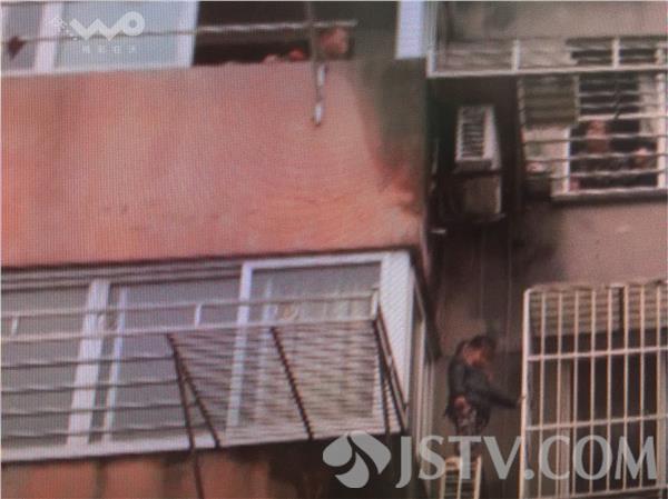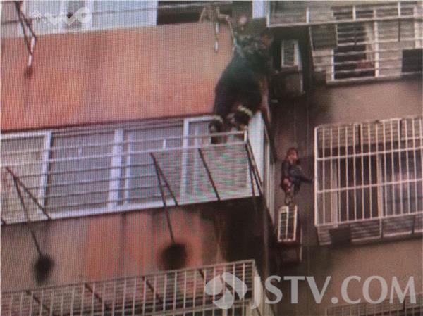 现场所见,小女孩站立3楼的空调外机上,一只手抓着邻近的防盗窗。救援人员从4楼外阳台处利用绳索滑至3楼去接近小女孩,并成功将孩子救了下来。