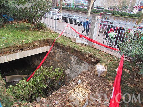 现场看到,塌陷绿岛的旁边,可以闻到有很明显的臭水味道。笔者看到沟上铺了一排楼板整体断裂,楼板上面有一层几十公分的土层种植了草坪和树木,而且楼板下面是一条排水沟,沟内不停地流动的污水。仔细观察,塌陷的绿岛面积约10平米,水泥楼板栽进坑,大坑约3米深,里面散落着泥土和植被。坑紧邻东侧是人行道,只有一道铁栏杆围墙,路边每天坐着老人家晒太阳,这些老人很担心 。据附近居民讲,春节前的一个晚上,外面下着大雨,大约零晨左右,突然“哐当”一声巨响,还以为地震,跑出来一看,原来是绿地又塌了,窟窿口呈一个不规则的正方形。如今只是用绿色塑料隔离板一拦了知,存在安全隐患。