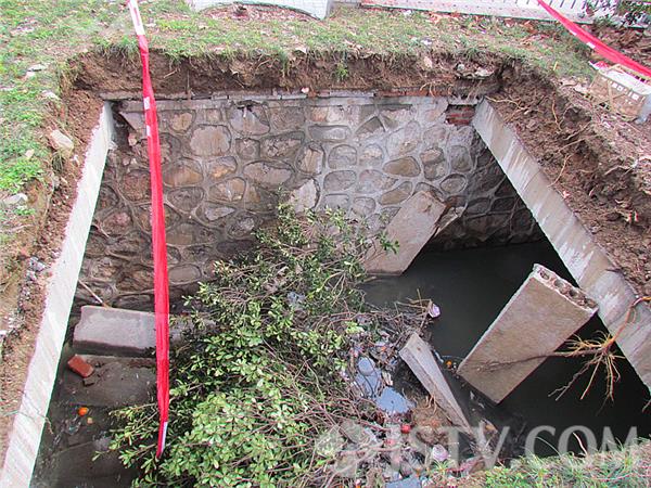 据了解,窟窿下面是玉带河支流,当时为了美观,将玉带河支流上铺了一层楼板,楼板上面有一层几十公分的土层种植了草坪和树木,没想到一年不到竟然掉二次。绿岛植被种植有好多年了,长年暴雨冲刷,绿岛下方承载的预制板被压断,估计那场大雨中积水沉重导致了坍塌。徐福庚 摄