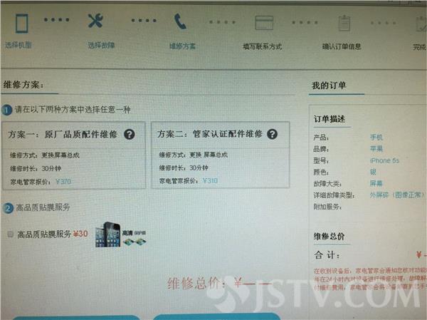 消费者如何选择这些维修企业呢?只要搜索'家电管家',登陆这个网站,可以在线给自己的维修服务下单。比如记者选择了维修手机苹果5S,在详细故障类型中选择外屏碎图像正常,网站就会提供原厂品质配件维修和管家认证配件维修两个方案,并且分别标明了价格。