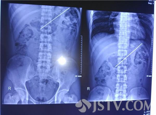 羊肉串的铁钎子怎么会进入患者胃里呢?原来,家住南京浦口区的陈某过年前因为琐事,一时想不开,吃烤羊肉串的时候顺手把一烤肉钎子直吞下去。之后小陈情绪一直非常激动,赌气不愿来院治疗。据小陈说,吞下烤肉钎子后并无太大感觉,只是每每肚子饿的时候就会感到钻心的疼痛。直到3月6日上午,这才在家人的劝说和陪同下慕名来到南京八一医院。