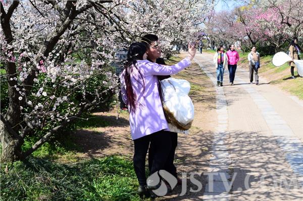 据悉,除了前期已开放的各个梅花品种,新近盛开的又增加了如“跳枝梅”、“红晕跳枝”、“素白台阁”等16个名贵品种,其中尤以“素白台阁”最为名贵,由于该花花瓣奇多,层层叠叠,犹如一座阁楼立于树梢之上,十分漂亮,吸引了众多游客及摄影爱好者前往观赏拍摄。现场注意到,不光美女帅锅们爱在梅花树下拍照留念,很多老年人也纷纷加入自拍一族,看到自己喜爱的梅花,总不忘站到树下给自己合个影。而那些酷爱摄影的“长枪短炮”们更自不必说,不会轻易放过这难得的拍摄良机。