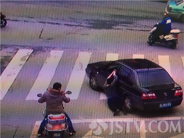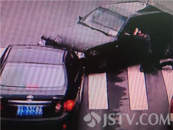 镇江市润州交警大队民警介绍, 他是闯红灯和另外一个方向正常行驶的一辆丰田轿车发生了碰撞,这个时候受害者其实他已经脚落地了,这个时候他完全有条件脱离危险,但是他没有,他又扒上车门,又被这个车带走了。