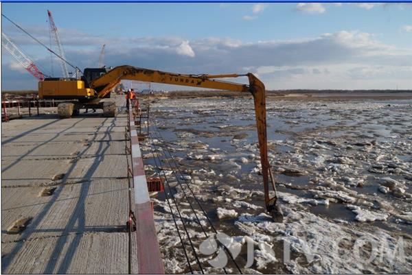 据中铁大桥局同江中俄铁路大桥施工Ⅱ标段项目经理程健介绍。凌汛到来前,项目部已经提前做好度汛准备,组织了应急预案预演,编制了防护方案,并在栈桥上游筑拦冰堤坝,在围堰迎冰流侧进行了三角框架引冰体焊制,以减少流冰对大桥施工造成的危害,全力以赴地做好我国首座中俄跨国铁路大桥安全流冰度汛的保驾护航工作。