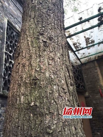 在常府社区粉妆巷19号刘氏庭园,一棵100多年的老槐树郁郁葱葱,十分高大挺拔。但与这些美好不相称的是,树上竟然有个钉子。一位居民表示,天气好的时候,树上经常会被拉上绳子,用来晒被子。在树的一侧,至今仍然挂着一根细细的钢丝。