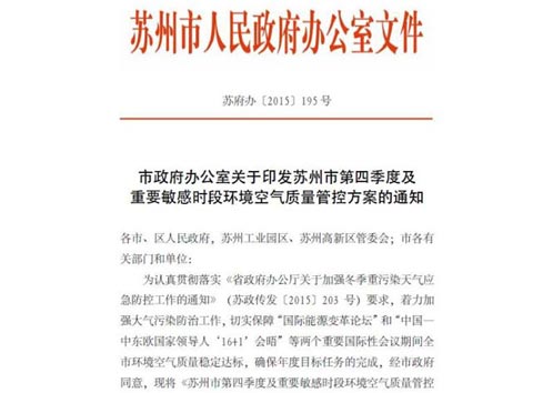据了解,苏州市政府办公室近日专门下发了《关于印发苏州市第四季度及重要敏感时段环境空气质量管控方案的通知》。