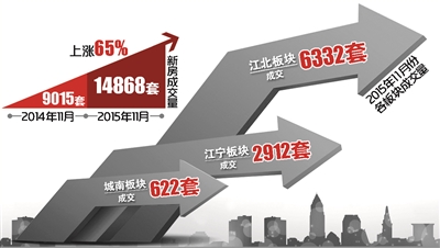 11月南京楼市共计有47家楼盘推出近6500套房源,11月份南京新房共成交14868套,环比10月成交量上涨了33.5%,同比去年11月9015套的成交量大幅上涨了65%。11月的认购量环比上涨了13.7%,同比去年11月上涨了47.8%,成为自2009年11月份以来南京楼市单月最高成交量,其中,江北板块以成交6332套房子将其他板块远远甩在了后面。
