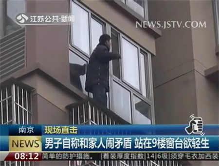 昨天中午12点钟左右,在南京市栖霞区和苑小区发生了惊险的一幕,一名男子站在9楼窗台外侧的平台上欲轻生,当地公安、消防、卫生等部门紧急赶到现场,进行救援 。