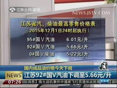 国内成品油价格今天迎来年内第12次下调。92号国五汽油每升下调0.11元,0号国五柴油每升下调0.12元。江苏调整后的成品油价格,95号、92号国五汽油分别为每升6.01元、5.66元;0号国五柴油为5.22元。普通小车加满一箱油大约节省五六元。