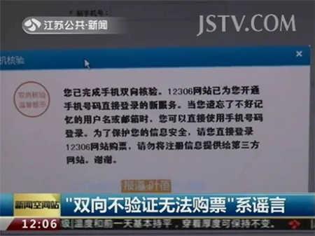 此外,为保障个人信息安全,12306网购火车票需要提前进行双向验证,旅客需将手机号码、用户名和邮箱同时绑定。但对于近期网上流传的“未验证的12月3日后不能网络购票”一说则不靠谱。12306网站客服人员表示,当用户登录网站后,会提示要在三天内验证;三日内如果不验证还是可以正常购票的,但三天后再购买车票就必须先验证手机了。