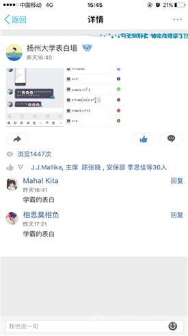 12月8日晚,扬州大学表白墙的主页君贴出一张“函数表白图”,列出六个不同的函数,旁边是效果图“I Love U”,并且未匿名。该条动态被广泛转发,并且最终找到了女主角,虽然女生暂时没有做出回应,但众多网友称:“学霸的表白就是不一般!”“这年头表白也要看智商啊。”言语之间,无不流露出惊叹与羡慕。