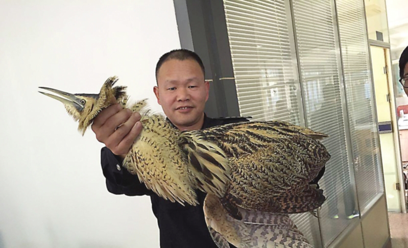 经查看,怪鸟并无明显外伤,可能由于饥饿过度体力不支无法飞翔。经常熟市梅李派出所人员细心地比对查询、辨认得知,该鸟名为大麻鳽(jian),别名大水骆驼、蒲鸡,属鹳形目鹭科麻鳽属鸟类,系国家“三有”保护动物(是指列入《国家保护的有益的或者有重要经济、科学研究价值的陆生野生动物名录》的动物)。