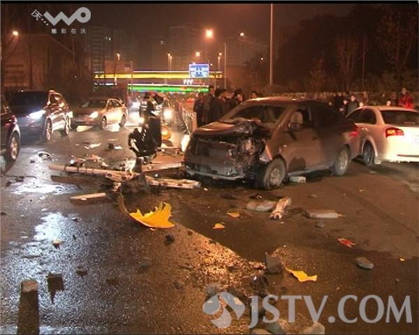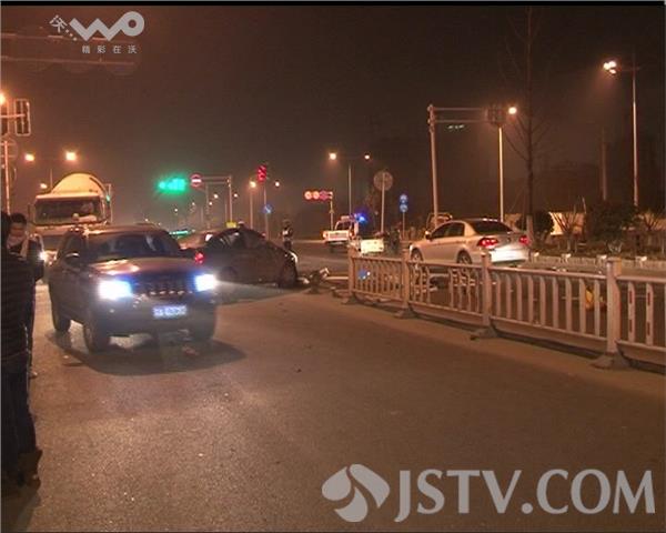 12月26号晚8点半,南京江宁区宏运大道一红绿灯路口,一辆由西向东行驶的轿车突然撞上路中央的护栏,造成车内一名乘客受伤。
