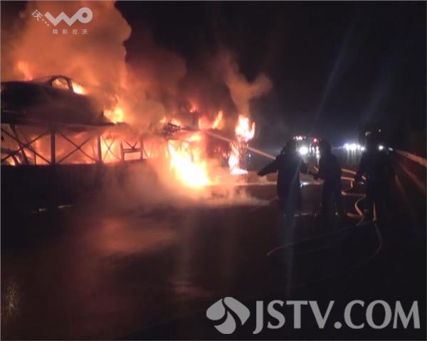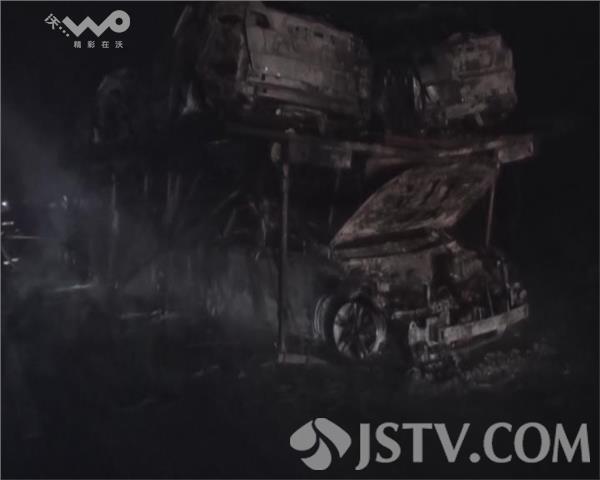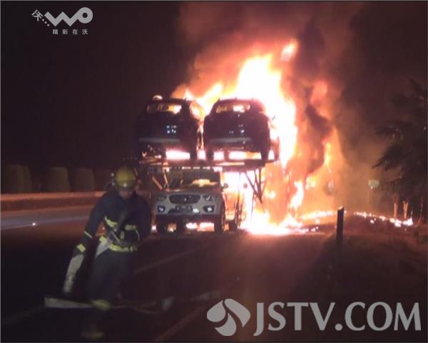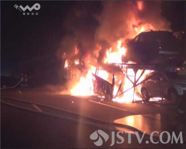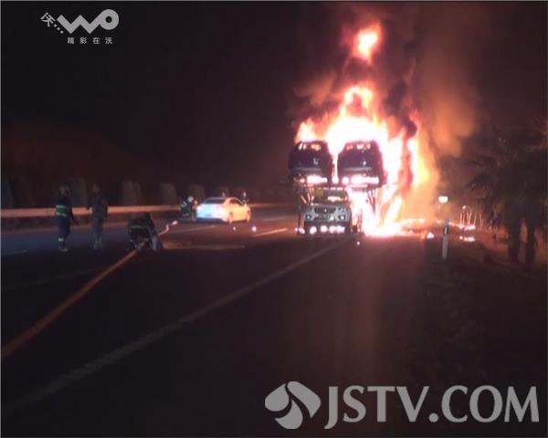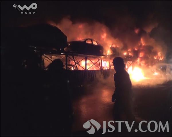 12月28日晚上7点多,无锡宜兴市宁杭高速往杭州方向2174段,一辆载有20辆新车的运输车发生自燃,现场火光冲天,接到报警后,救援人员立即赶赴现场进行处置。