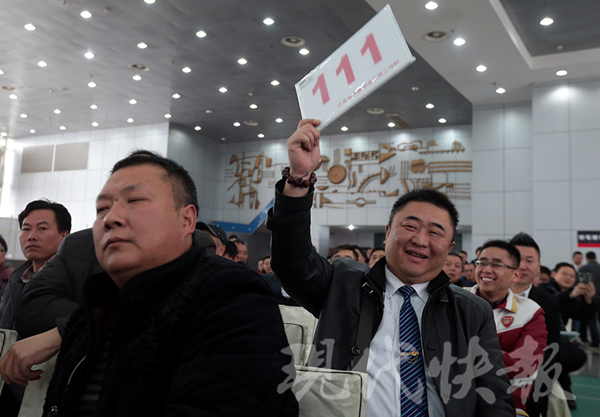“之前我们就看中了三辆车,成功竞拍到了两辆,15万成交的这辆大众正好卡在了我们的心理价位上。”朱勇告诉快报记者,他们这次来就是势在必得,也提前做好了功课,研究了车的各项指标。此前,朱勇还拍走了一辆2007年的海狮汽车。“当时的想法就是一定要拿下。”为此,朱勇特意领了“111”的号牌,“谐音‘要要要’”。在轮番举牌三四十轮后,最终这辆9.8万元起拍的海狮汽车被他以15.7万元拍走,溢价5.9万元,这也是当天溢价最高的两辆车之一。