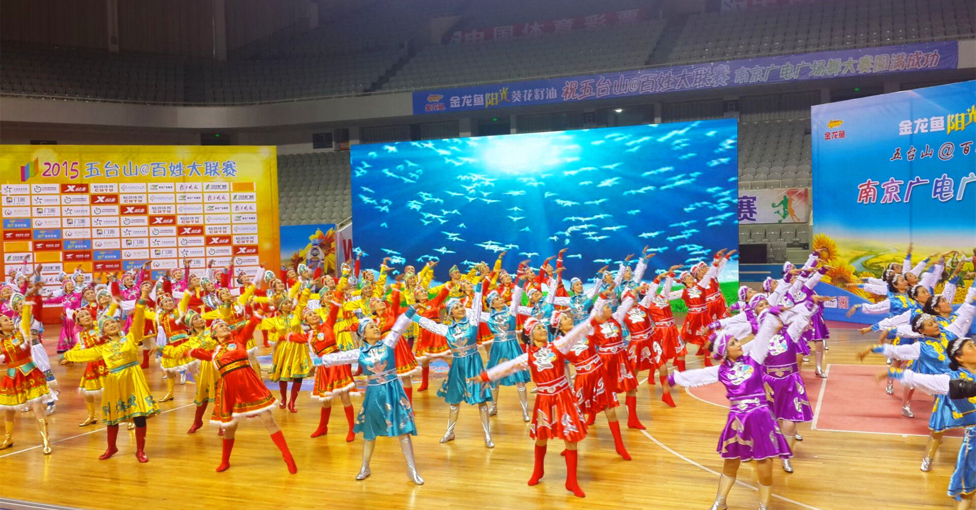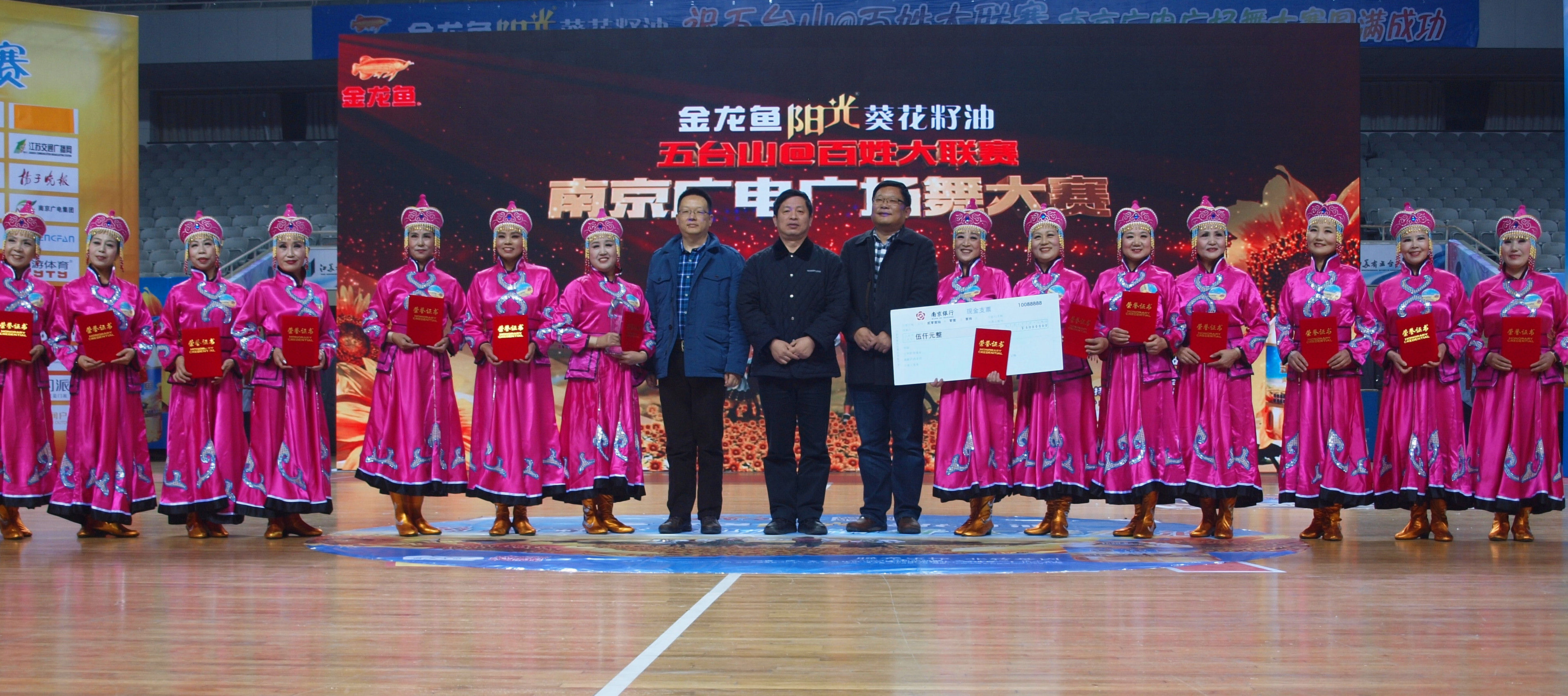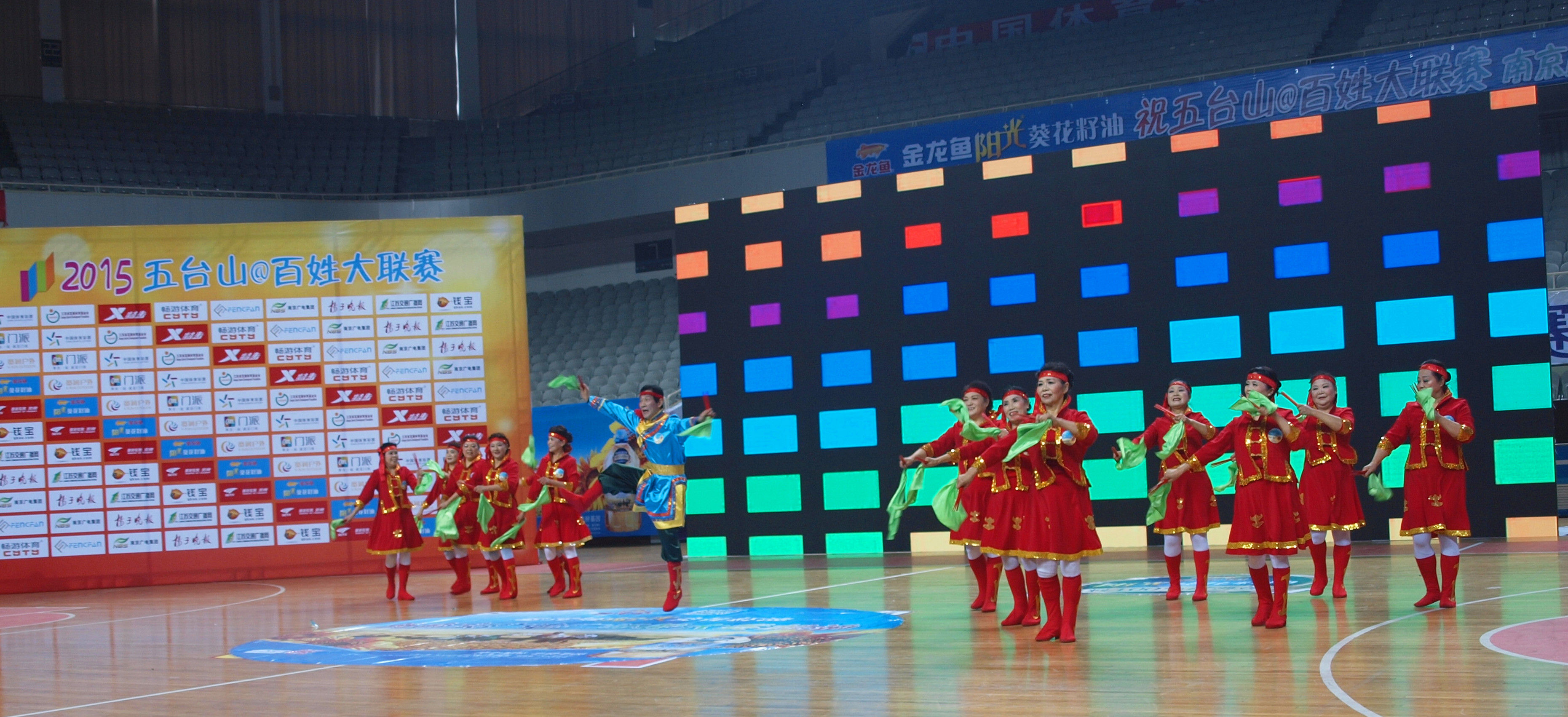由江苏省体育总会、南京广播电视集团、江苏省社会体育管理中心、江苏省五台山体育中心等单位联合主办的“金龙鱼阳光葵花籽油”五台山@百姓大联赛南京广电广场舞大赛自15年10月份开赛起便受到了群众的高度关注和热烈响应,赛事历时3个月,共有来自全南京市和周边安徽地区的240支广场舞队伍共3000余人经过了14场周赛、5场月赛和1场晋级赛的角逐,最终18支优秀代表队进入1月10日当天的总决赛,争夺1个一等奖、3个二等奖和5个三等奖和各大奖项,南京电视台将现场录播。在周赛月赛期间,群众参与热情高涨,每周通过南京电视台生活频道《舞动社区》栏目现场投票和《生活大参考》官方微信为参赛队伍网络投票的人数,最高一周分别达到7.4万人和1.7万人。