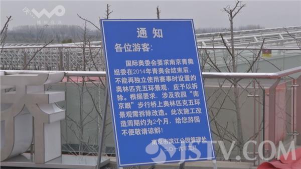 南京国际青年文化公园的相关工作人员告诉记者,奥委发函称,2014年青奥会结束之后,就不能独立使用赛事时设置的奥林匹克五环景观了。南京眼步行桥上的五环标志将被南京青奥会会徽所取代。 南京国际青年文化公园工作人员介绍,是留一个青奥的标志在上面,不是拆掉就不管它了。工作人员告诉记者,由于无法使用大型器械作业,南京眼步行桥上五环景观的拆除将耗时两个月,在这期间,游客还是可以自由通过步行桥。