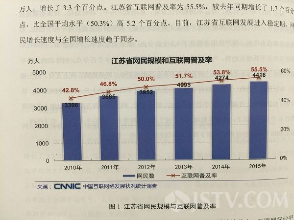 截至2015年12月底,江苏共有网民4416万,手机网民达到4067万,互联网普及率为55.5%;江苏省青少年初次接触互联网的年龄从2014年的8.2岁下探至7.5岁。